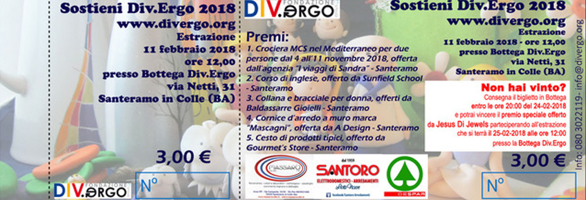 La Fondazione Div.Ergo onlus ha organizzato a Santeramo in Colle una lotteria di beneficenza denominata "Sostieni Div.ergo", allo scopo di raccogliere fondi per le diverse iniziative realizzate all’interno del progetto d’inclusione sociale Div.ergo rivolto a giovani con disabilità intellettiva. Domenica 11 febbraio 2018 alle ore 12,00 nella sede della Bottega Div.ergo in via F. Netti [...]